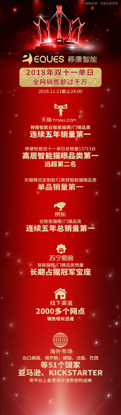 雙十一購物狂歡節2135億交易量的火爆還未消退,各大商家已經紛紛曬出了“成績單”,歷經不眠不休的酣戰之后,是來自各大行業的捷報。11月11日,在日趨火爆的智能家居領域,移康智能繼續保持智能貓眼品類第一的勢頭,蟬聯天貓、京東、蘇寧易購等各大